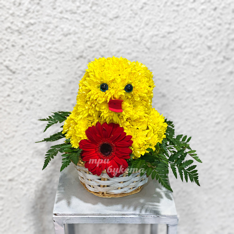 Цыпленок из хризантем в корзине