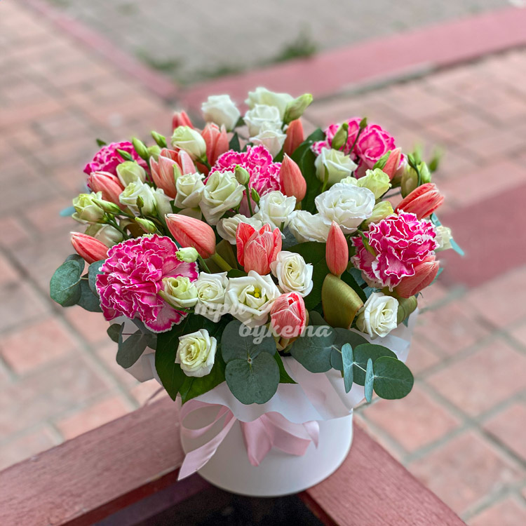 Тюльпаны, гвоздики и эустомы в коробке